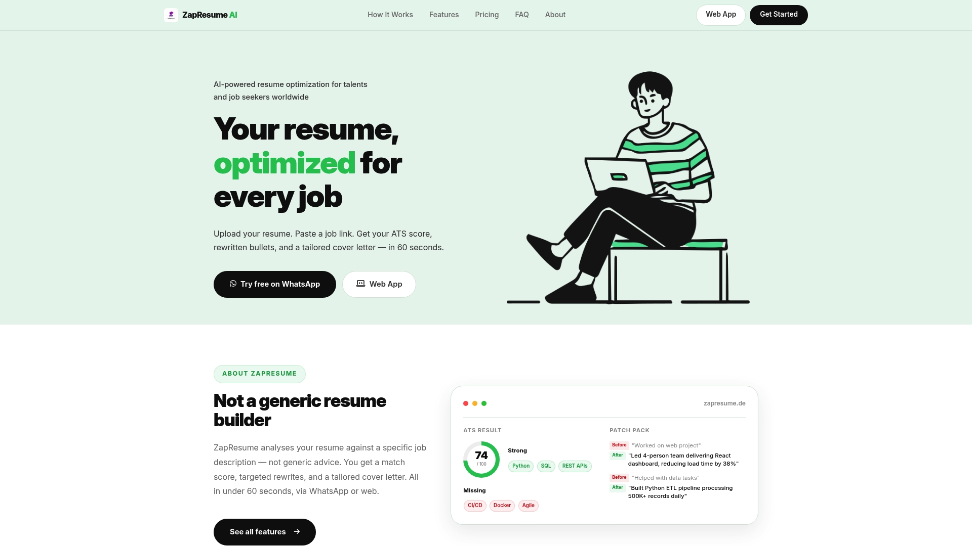 ZapResume AI gives you instant resume optimization built around the specific job you're applying for. Upload your resume, paste in the job description, and get a real-time ATS fit score along with targeted keyword suggestions. The AI resume optimizer identifies exactly what's missing and rewrites your bullet points to match. You can also generate a tailored cover letter with the AI cover letter generator in seconds. Check the full resume features overview to see everything available. No downloads, no account required to get started.