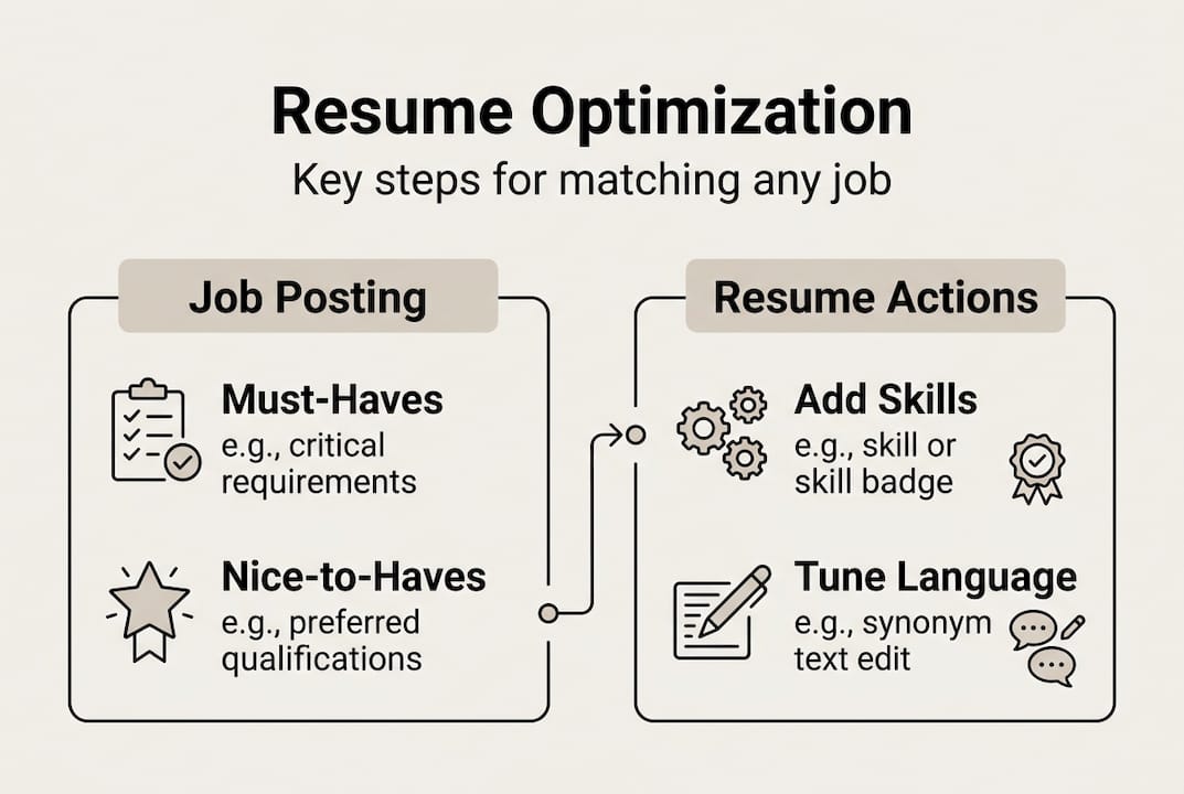 | Experience bullets | Task-focused descriptions | Outcome-focused, using job's exact terminology |